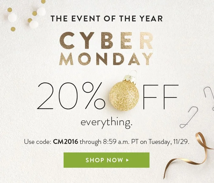 We use Minted for so many things, and we had to share their Cyber Monday sale since it is just too good. Through Tuesday morning you will get 20% off every. single. thing at Minted.com. There are so many things to check out, including gifts, holiday cards, wedding invitations, art, party decor, kids room decor, the list goes on. Also, their free recipient envelope addressing is simply the best, you can thank us later. Happy Shopping!